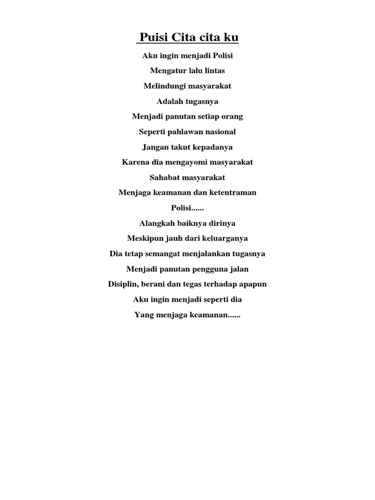 Cinta artinya sebuah emosi dari kasih sayang yg kuat serta ketertarikan pribadi. Cita cita ku inggin menjadi pilot. Puisi terbagi menjadi dua, yaitu puisi lama dan puisi modern. Pernah aku membuat puisi tentang cinta satu buku. Puisi cita cita menjadi pilot. Melihat indahnya masa depan dan bersyukur atas alam ciptaan tuhan. Mereka tidak dianggap sebelah mata oleh masyarakat. Akan kubangun sebuah rumah yang indah dengan desain sederhana yang megah. Aku ingin mejadi seorang guru. Lulus tes kesehatan meliputi jantung, mata, dll. Tamasya dalam gelap (karya remy sylado). 3.6 menggali isi dan amanat puisi yang disajikan secara lisan dan tulis dengan tujuan untuk kesenangan. Ku berangan tuk bisa berjalan bersama awan.